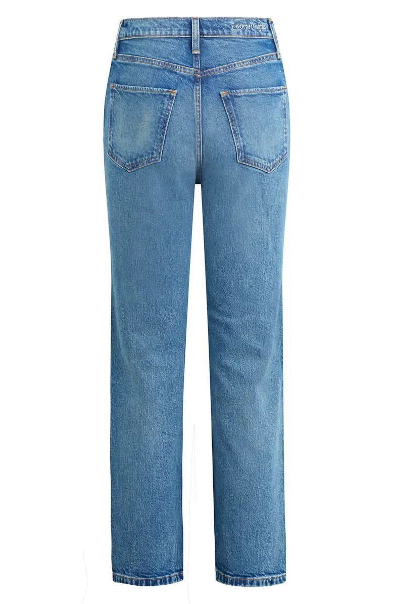 This Valentina silhouette in Maui is a true straight leg ankle made from comfort stretch denim in a medium-blue wash with whiskers and fading. Meant for everyday wear, this style is fitted at the hips with a 12" rise and straight down from thigh to opening with a 28" inseam. (Favorite Daughter embroidery on the back waistband, of course.)