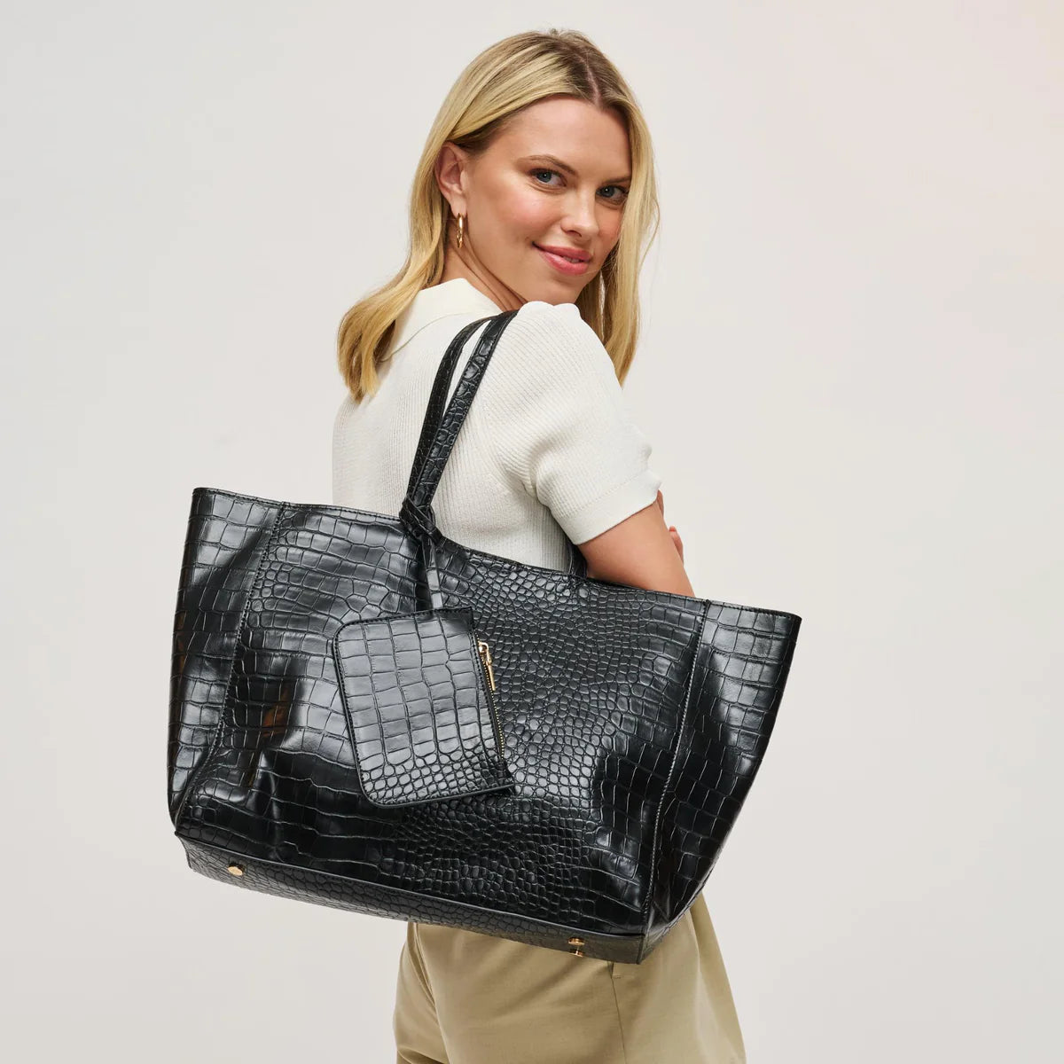 - Exterior Details: Gold Hardware, Croc Print, Dual Shoulder Straps, Detachable Zip Pouch