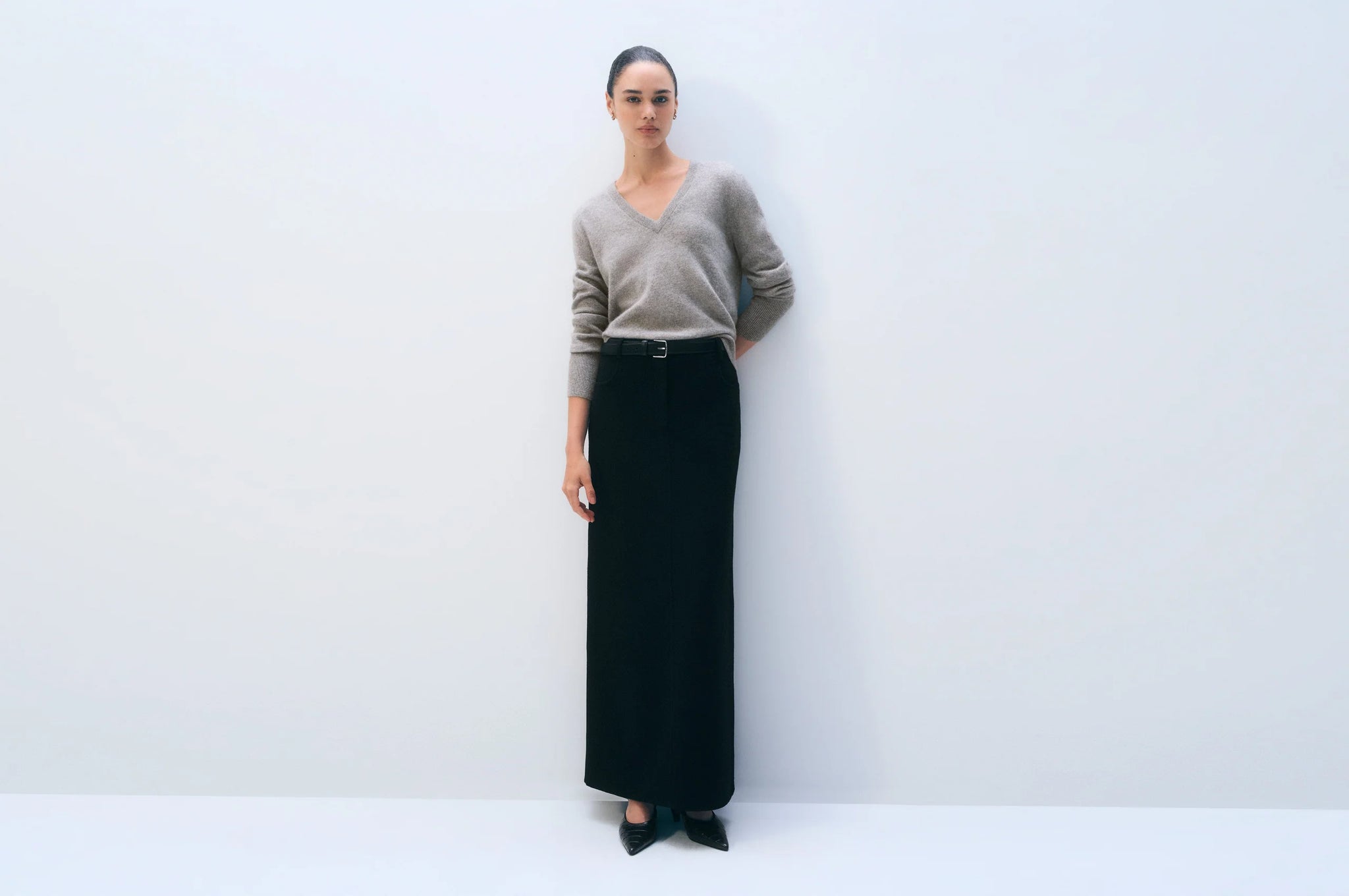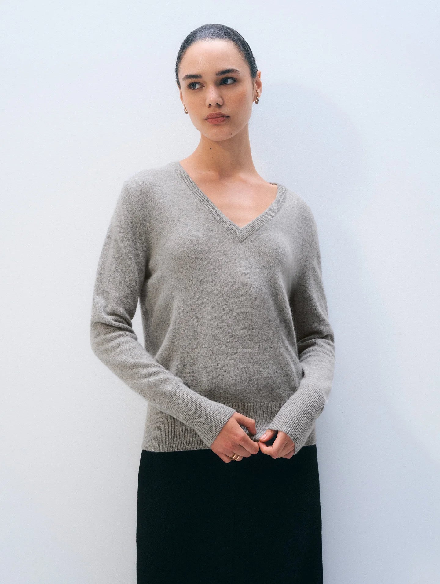 The effortless essential. Knit from 100% cashmere, this sweater boasts a flattering V neckline, neatly ribbed trim, and center-back detail. Relaxed with a longer length, size down for a slimmer fit.